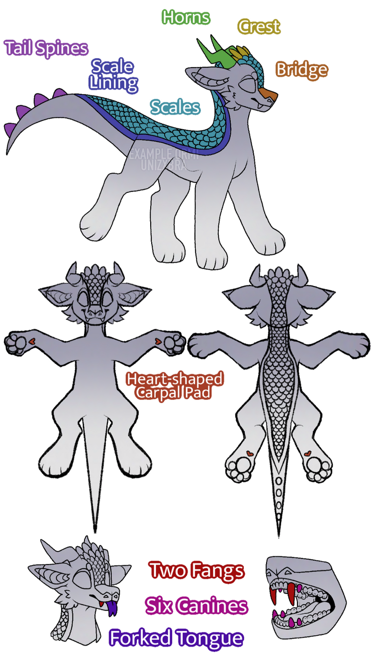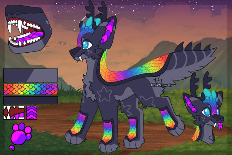 This ormi has a rainbow pattern on his scales, so his leg scales also have a rainbow pattern. His scale lining and secondary colors are the same color as the scale lining on his legs. The ormi's tongue, paws, and inner ears are all purple and pink, following the same "alternating" pattern.